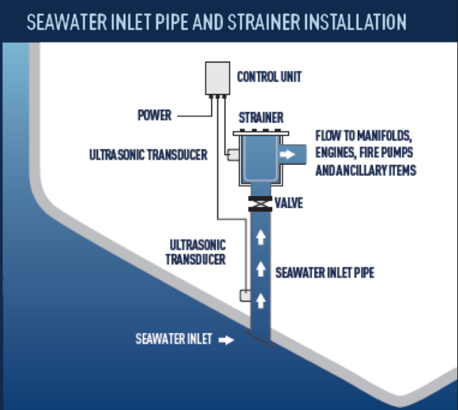 Ultrasonic sound waves resonate in the sea chest and pipe walls disrupting barnacle and mussel larvae settlement. Instead of attaching themselves to the sea chests, strainers, manifolds and pipework on which ultrasonic transducers are installed, these organisms and larvae pass through to the discharge point. The environment created also causes mortality, preventing further development.
